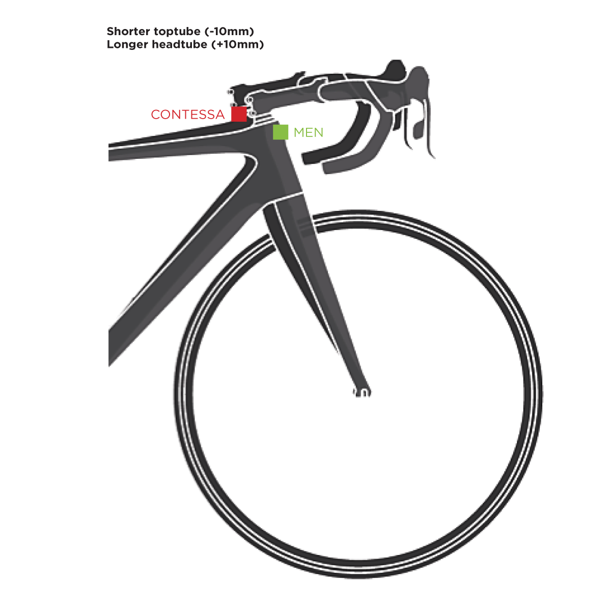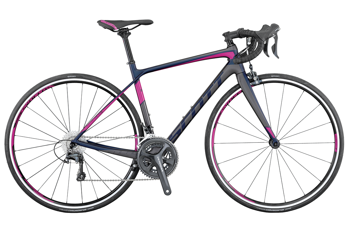 Scott Sports say: SCOTT aims high when it comes to the comfort and ergonomics of a product such as the Solace. Therefore a women’s specific geometry for the Solace Contessa lineup has been developed. A 10mm shorter toptube combined with a 10mm longer headtube take into account the different proportions of women and offer a perfect fit for female road cyclists.