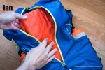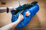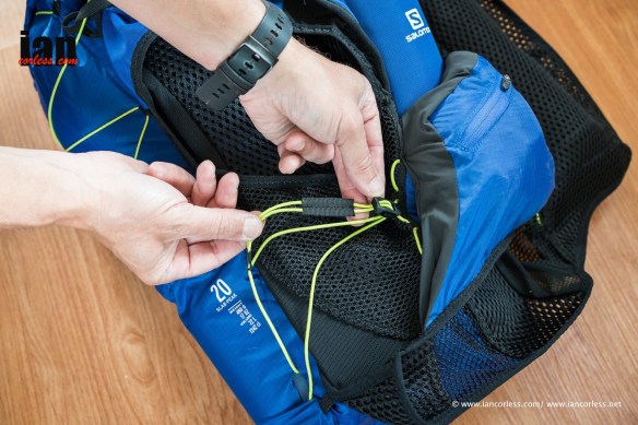 On the top of the rear of the pack above the zip, is a central cord pull. Pull this and the yellow cord that wraps around the pack pulls tighter and compresses the contents. Great when the pack is full to make everything tight and secure but especially useful as the days pass when racing and the pack contents become less.