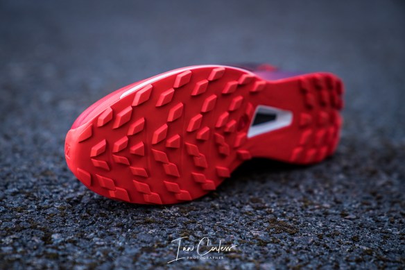 The grip looks pretty classic for a Salomon trail shoe. It’s red, with a standard trail lug that is not too aggressive. So, this shoe is obviously not designed for mud, it is a hard trail shoe that can be used on a multitude of surfaces, be that wet or dry. It is, “an all-new Contagrip® outsole, with premium wet traction and reverse lugs on the heel area, delivers confident grip, especially on the downhills.”