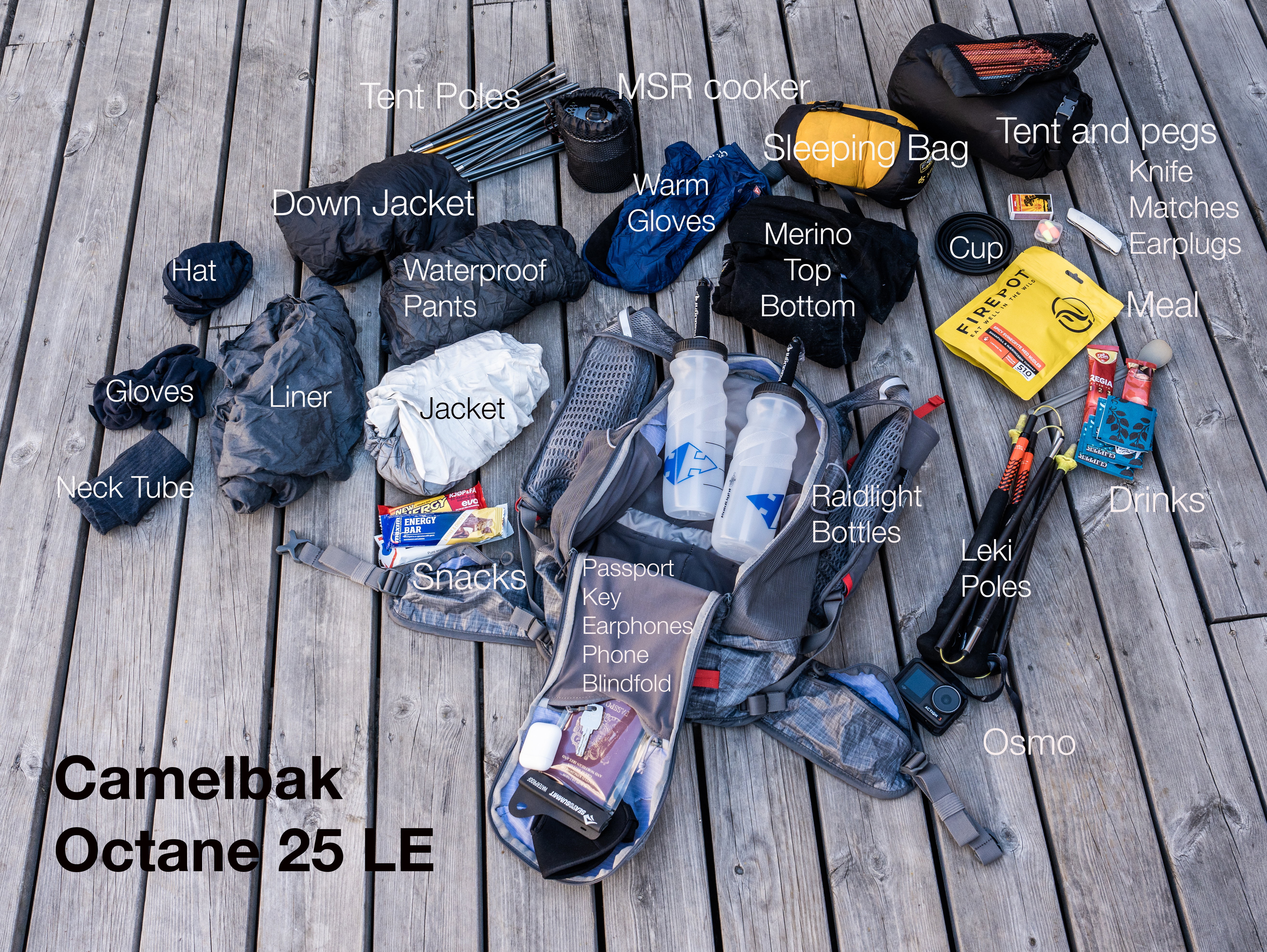 Octane 25 fully packed with tent,sleeping bag, apparel and food for a 1-night fastpack.
