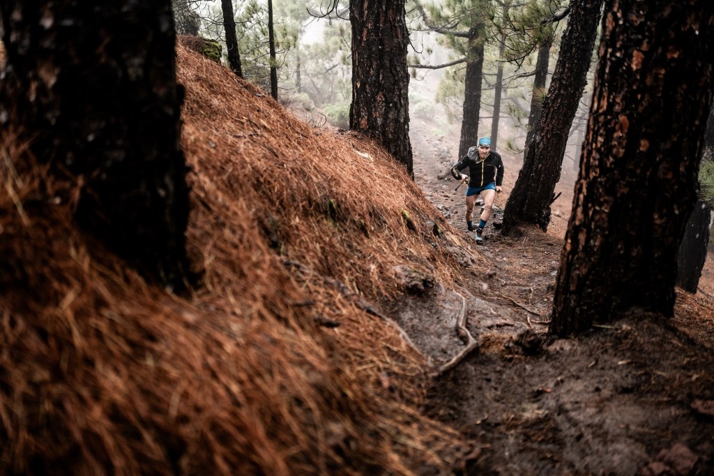 The long drop from the summit to Tazacorte Puerto – a descent of over 2,000 vertical meters is never easy. But in this weather, it became treacherous. Slick rocks and pine needles, water-logged switchbacks punished tired quads. Fatigue met fear. But a glimmer of better weather below the cloud gave runners hope.