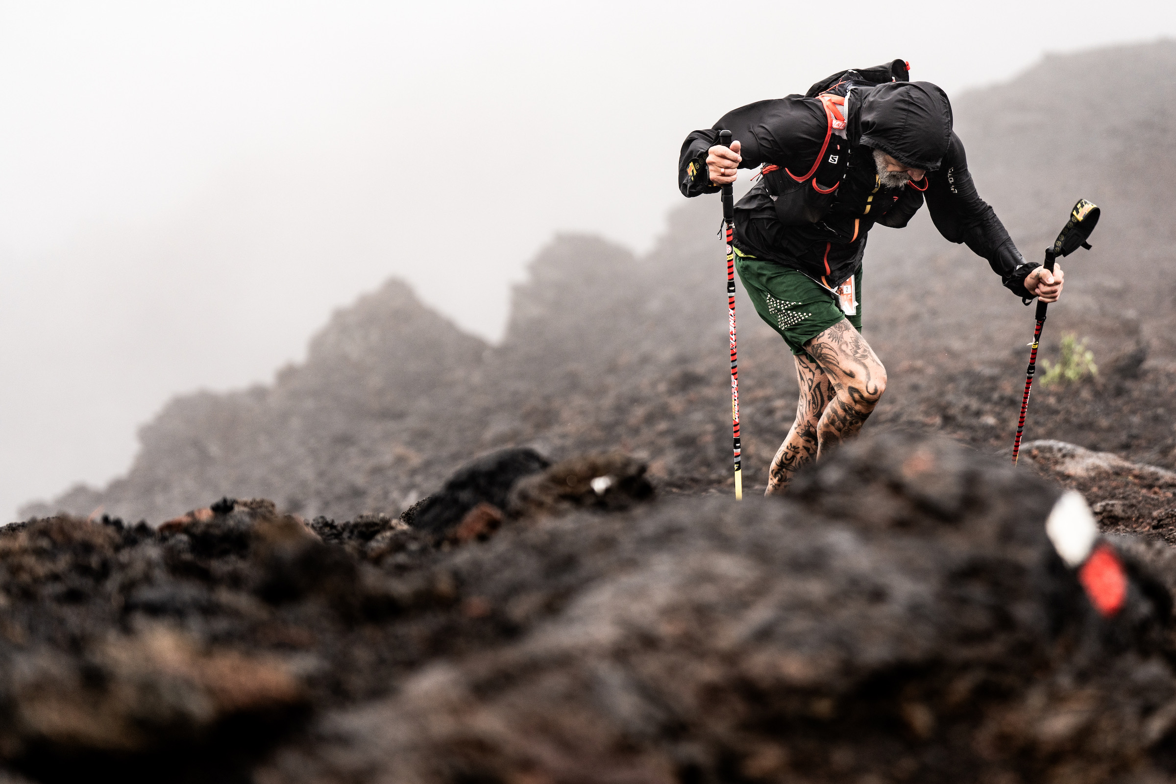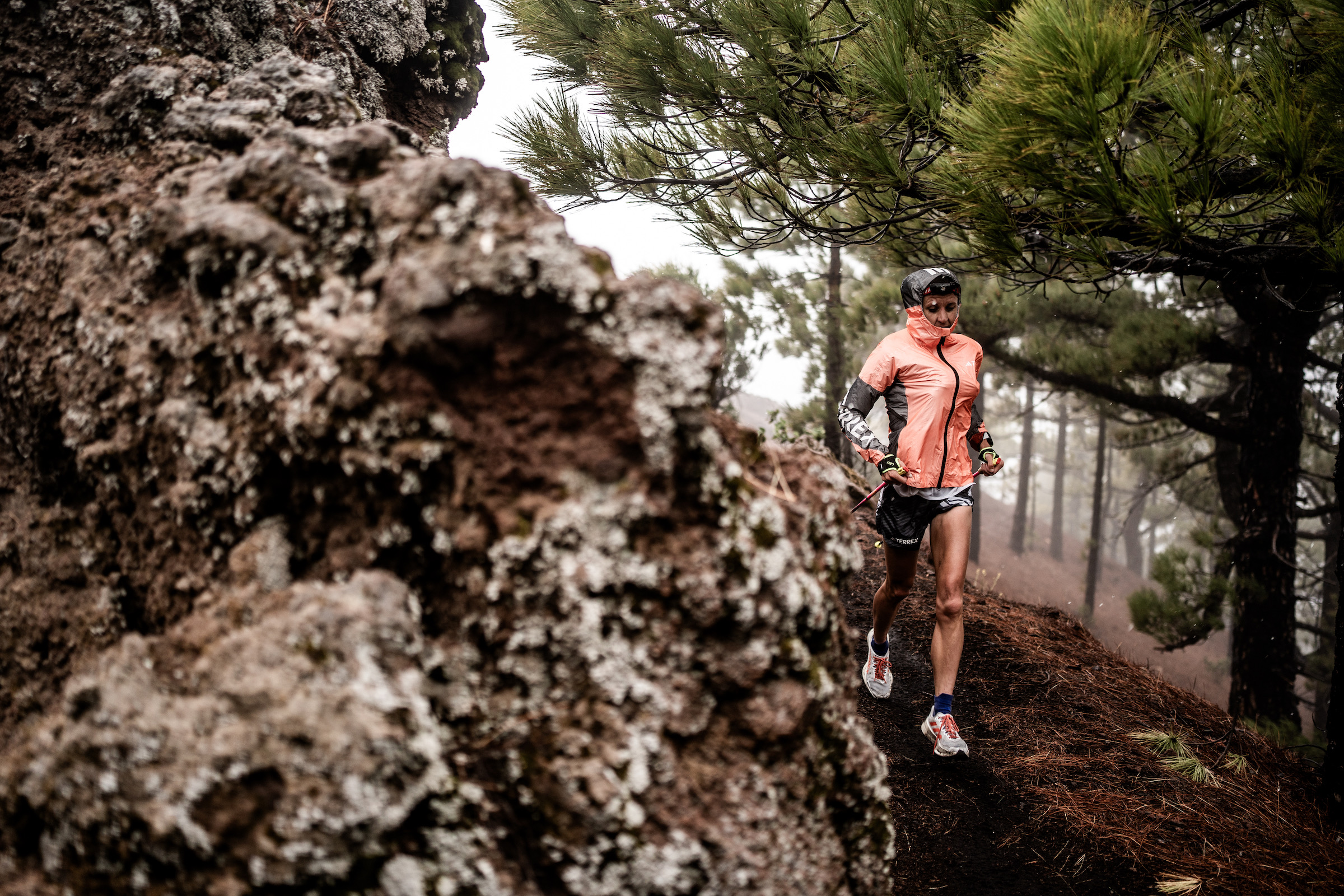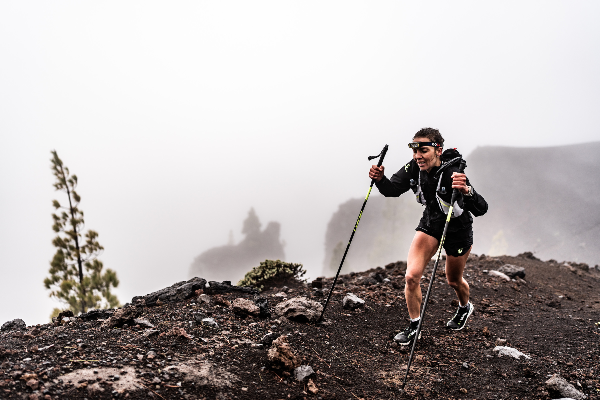 From the moment runners left the Fuencaliente lighthouse at sea level, the signs were there. Dark skies. Driving rain. And as the climb up the GR131 trail began, the weather only worsened. Wet volcanic gravel shifted underfoot. Winds battered the open and exposed sections. Every gain in elevation brought colder air, heavier rain, and stronger gusts.