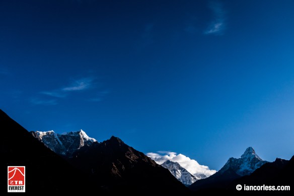 A damp and chilly night soon passed to greet the runners with spectacular views of the Himalayas – Everest and so many more completely visible from camp.