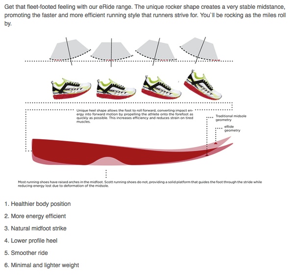 Scott say about eRide, ‘Get that fleet-footed feeling with our eRide range. The unique rocker shape creates a very stable midstance, promoting the faster and more efficient running style that runners strive for. You`ll be rocking as the miles roll by.’
