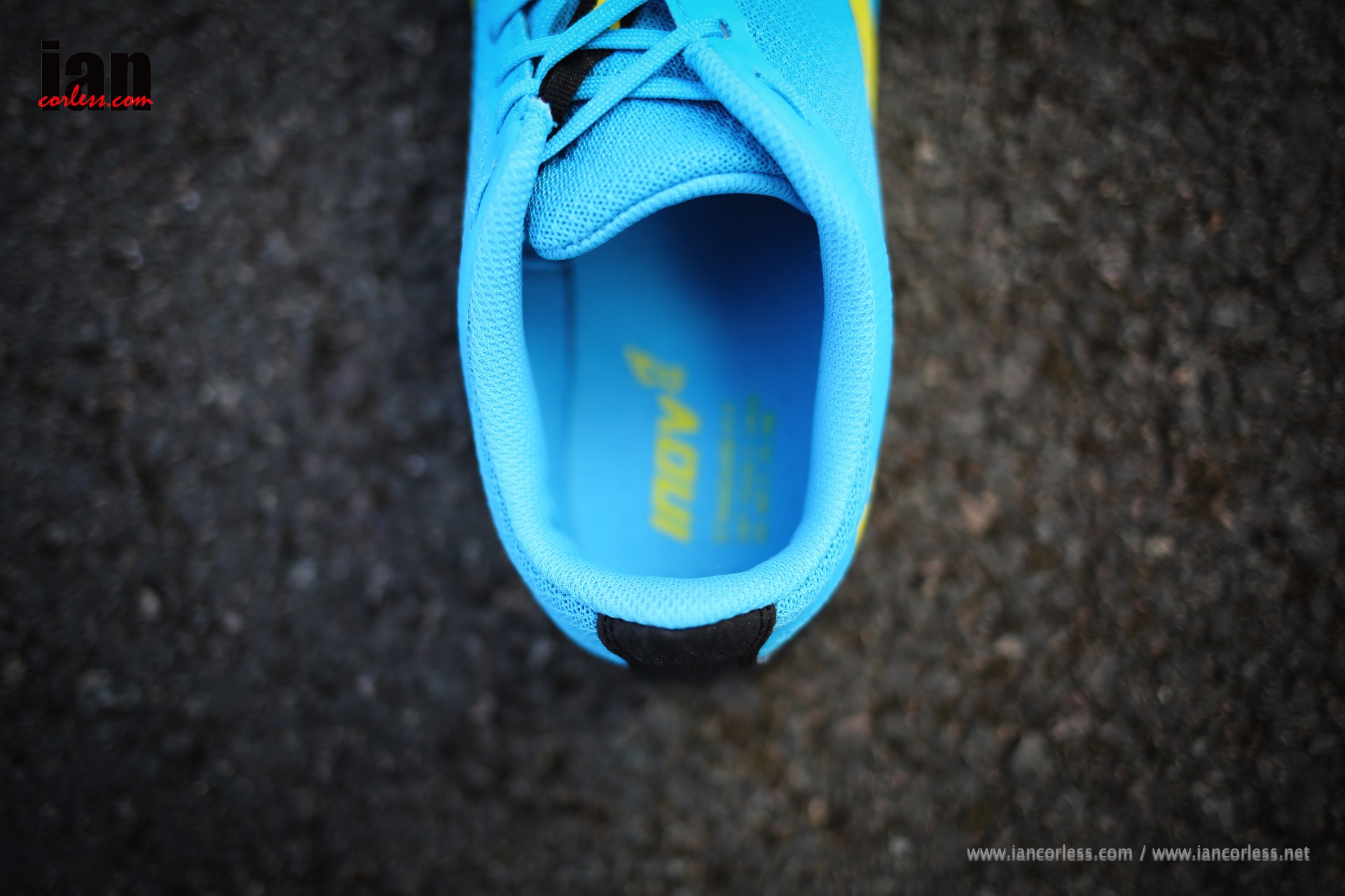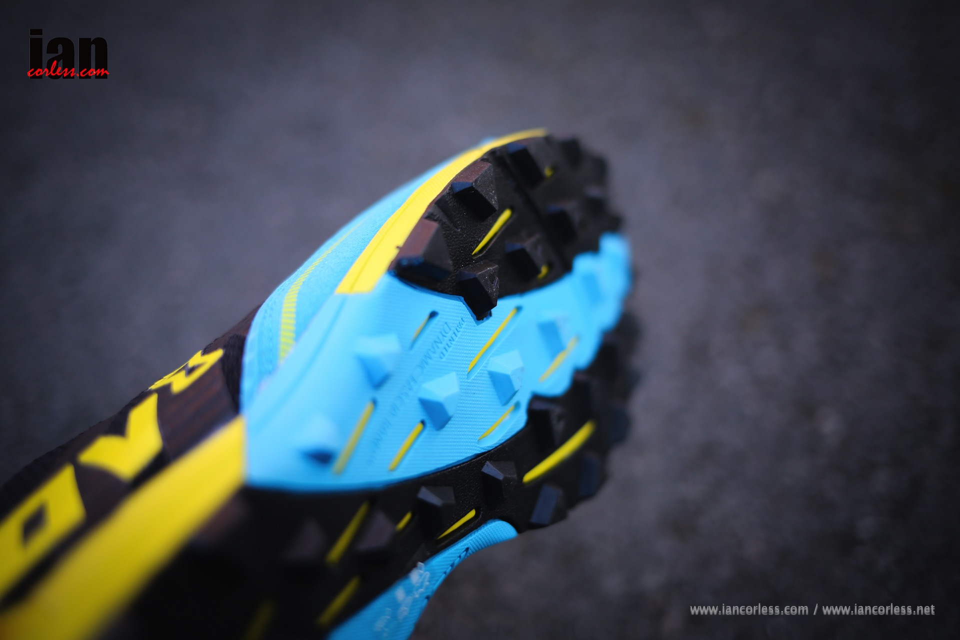 The upper is quite unbelievable, I don’t think I have ever witnessed something so airy and breathable. It’s like a sieve which allows water to escape immediately. There are several extremely thin reinforced layers on the outer – toe, side, heal and instep. Inside there is an additional thin layer (in yellow) that contrasts with the black mesh upper to create the two-tone black/ yellow look of the shoe and additional support structure.