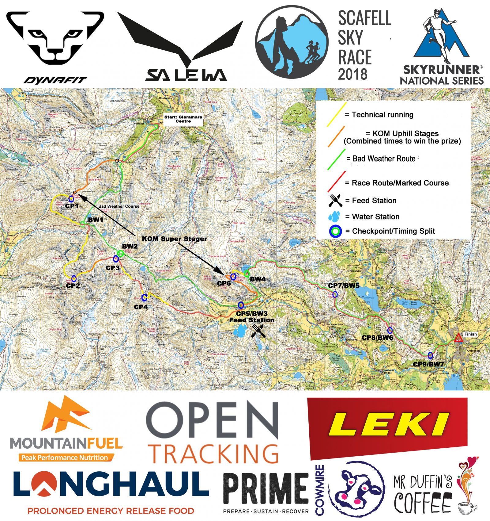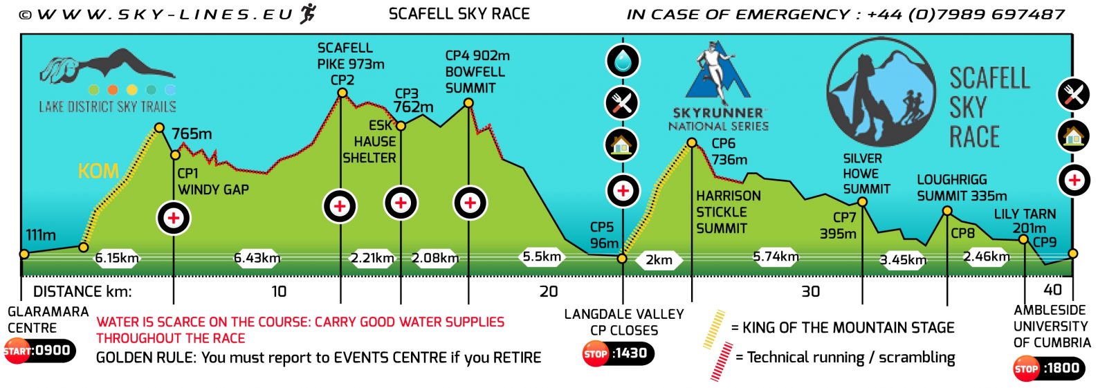 The race starts at 0900 from Seathwaite Farm and the first runner can be expected in Ambleside around 1330, however, remember, this may well be a fast year… arrive at the finish early! The route is a classic to be reckoned with. Participants willsummit Englands highest mountain and traverse some of the most challenging trails in the central Lake District via sections of scree and light scrambling thrown in.  Scafell Sky Race is a serious test of nerve, skill and endurance.