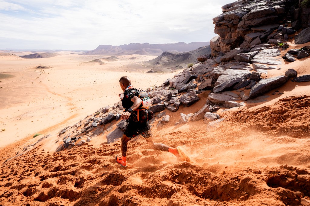 The route kicked off along a dramatic ridge, a high line with sweeping views in every direction, one of the most stunning stretches in MDS history. Sand seas rolled endlessly below, broken only by the occasional rocky outcrop or camel track winding off into nowhere.
