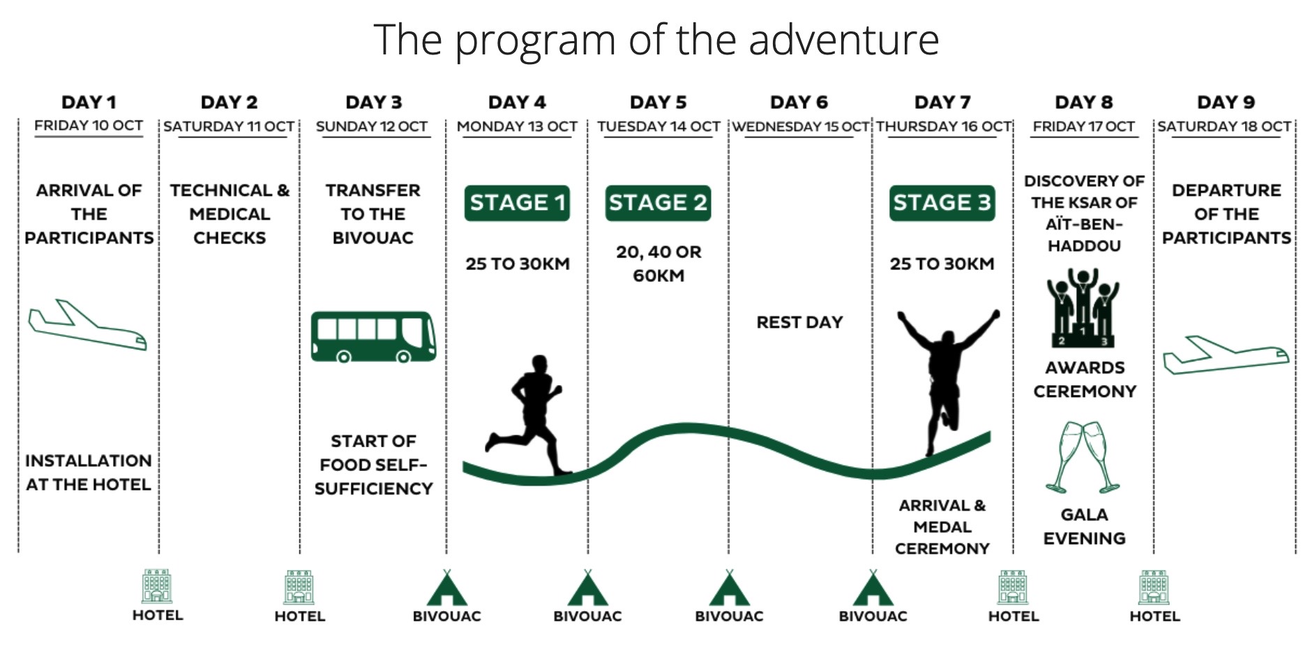 A 10-day adventure, spending 7-nights in the desert, the trek course will cover between 70 and 120km’s divided into several stages. The distance will be for you to decide based on your personal desires and ability. Unlike MDS – The Legendary, this is not a self-sufficient experience, therefore, participants will only need to carry a light pack with essential items.